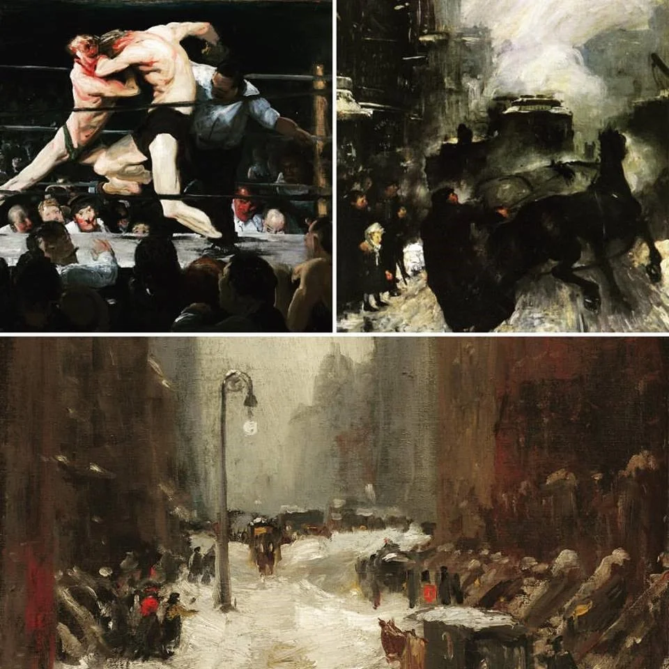 The Ashcan School. Clockwise: George Bellows, "Stag at Sharkey's" (1909), "Steaming Streets" (1908), and Robert Henri, "Snow in New York" (1902).